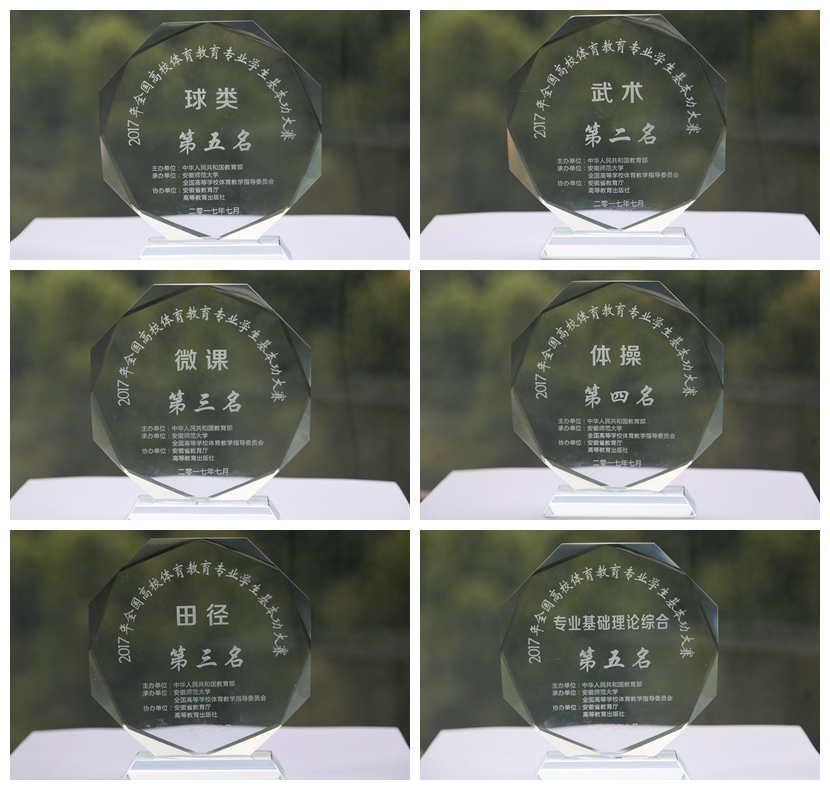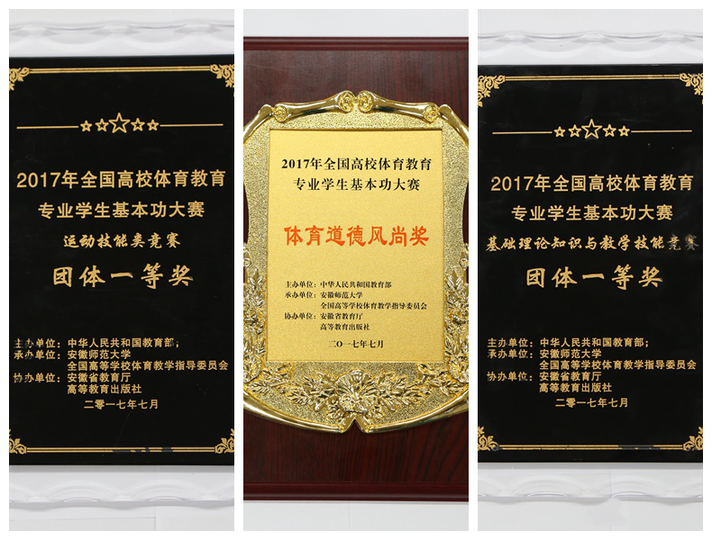 2017年6月28日至7月3日,由中华人民共和国教育部主办,安徽师范大学、全国高等学校体育教学指导委员会承办的全国高校体育教育专业学生基本功大赛在安徽师范大学顺利举行。此次比赛,由教育部抽取贵州师范大学、吉林师范大学、山西大同大学等23所高校参赛,并在每所高校中随机抽取8名(2女6男)学生,总计184名学生参加比赛。122cc太阳集成游戏代表队分别荣获团体一等奖、运动技能类竞赛团体一等奖、基础理论知识与教学技能竞赛团体一等奖。