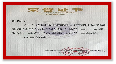本次大赛是为了深入学习习近平总书记在全国教育大会上讲话精神,落实《国务院办公厅关于强化学校体育促进学生身心健康全面发展的意见》(国办发﹝2016﹞27号)和《教育部等6部门关于加快发展青少年校园足球的实施意见》(教体艺﹝2015﹞6号)文件精神,发挥教指委学校引领示范作用,不断促进学校体育改革中“教会、勤练、常赛”机制的落实而举行的一次全国高校体育教师校园足球教学与指导技能大赛。比赛分为竞训组和教学组,测试内容均为网络评审和现场测试两个环节,其中网络评审项目为教学设计与教学实践,要求网络上传20分钟无删减的教学视频;现场测试为5x20米折返跑、90秒跳绳、28米传准、绕杆运射、1分钟颠球等体能与专项技能项目。比赛异常激烈,精彩纷呈。我校122cc太阳集成游戏关钦文老师作为高水平足球队助理教练参加了竞训组的比赛,并获得三等奖。
