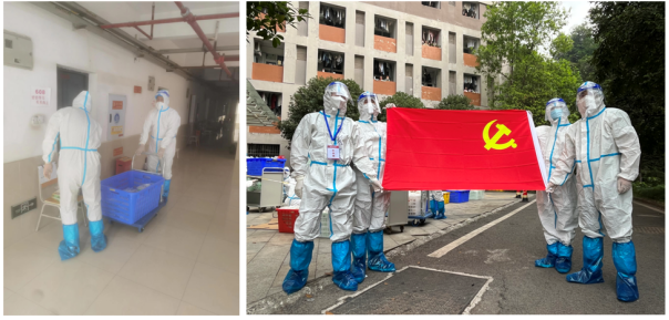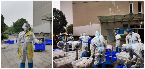 10月13日,新北区学生公寓24栋确诊学生的2名室友也相继确诊为阳性。学校党委决定成立临时党支部,组织党员志愿者团队深入疫情风险最高的24栋开展工作。原本负责核酸检录的胡磊老师听到消息后,立即积极响应,主动申请加入这个光荣的队伍。虽然那里是疫情风险最高的地方,但是他没有半刻犹豫,只想尽自己的一点微薄之力,让校园早日恢复生机。他匆忙安顿了妻子和女儿,打包上行李,义无反顾地奔赴疫情最前线——新北区公寓24栋。在后面的几天里,他和志愿者同伴们每天身着厚厚的防护服,一箱箱地搬运、一趟趟地爬楼,把物资一份份的送到学生手中,为3个楼层、100多名学生送去一日三餐、运送日用品;完成5个层楼、200余名学生的核酸检测工作。所有任务完成后,他才发现腰酸腿疼,全身早已湿透。
