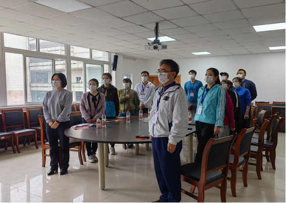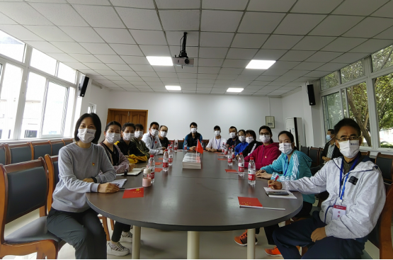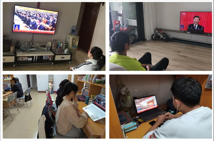 一大早,学院党总书记王静、院长范文杰、副书记张薇薇和十五名坚守工作岗位、志愿抗击疫情的教职工聚集在二楼会议室等待收看开幕会直播。抗疫先锋胡磊老师在北区24栋志愿者临时党支部观看。