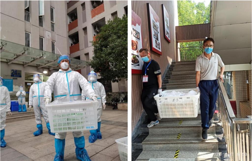 10月11日上午,122cc太阳集成游戏组成范文杰、张亚峰、刘倩楠、胡磊、王拥军、郑快、关钦文、陈国柱首批8人的志愿者服务队,志愿者一进入校园就迎来“首战”,开始核酸检测、送餐发放等工作。范文杰院长亲自进入核酸检测阳性患者的新北区24栋宿舍楼,给密切接触者检测核酸;陈国柱、关钦文、张亚峰老师给北区24栋危险系数最高的7、8楼送餐。第一次全副武装变身“大白”,第一次到阳性患者刚离开的宿舍、第一次和密接密切接触者的近距离接触,122cc太阳集成游戏的志愿者冲锋在前,打响了志愿者服务队抗疫的“第一枪”。