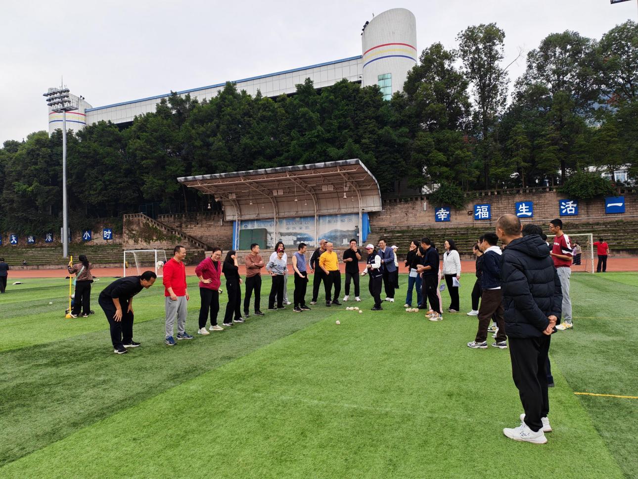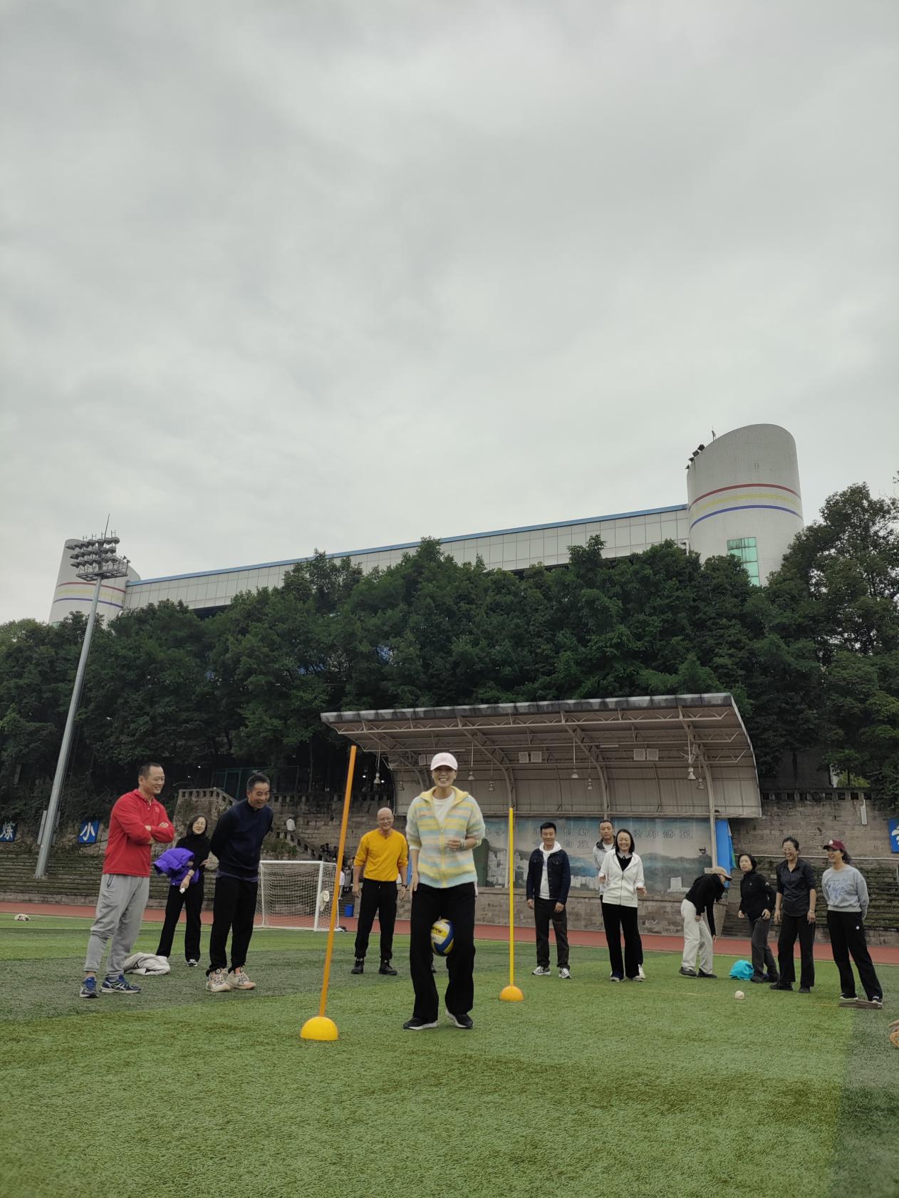 活动中,在投沙包环节,老师们化身“神投手”,手持沙包,瞄准靶心。一道道优美的抛物线划过空中,每一次精准命中都引来阵阵喝彩。在企鹅漫步环节,老师们模仿企鹅摇摇摆摆前行。看似简单的动作却充满挑战,有的选手稳步向前,有的途中“失误”引得全场开怀大笑。在摇摆接球手环节,前方队友紧凑抛球,一名队员腰系弹性绳,奋力前倾接球。每一次惊险接球都凝聚着信任与配合,将“同心同行”的主题体现得淋漓尽致,将活动气氛推向高潮。