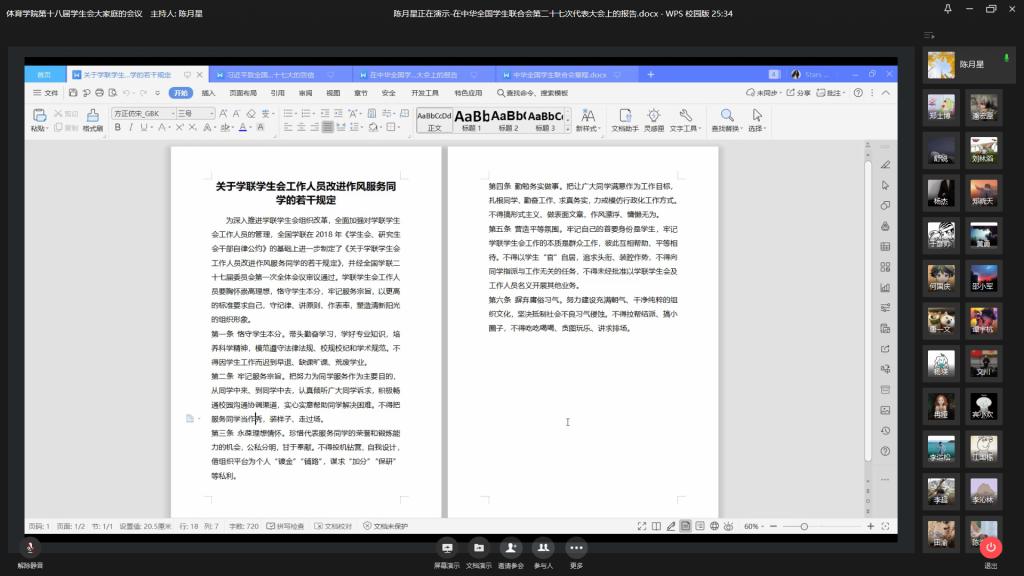 会议开始,院学生会学生干部陈月星同学带领大家回顾并学习《勇于自我革命服务同学成长在实现中华民族伟大复兴中国梦的进程中书写青春篇章——在中华全国学生联合会第二十七次代表大会上的报告》和《中华全国学生联合会章程》。他分享了大会的主题,即高举习近平新时代中国特色社会主义思想伟大旗帜,全面贯彻习近平总书记关于青年工作的重要思想和关于教育的重要论述,坚持党的领导,把握时代主题,勇于自我革命,服务同学成长,团结带领广大同学在实现中华民族伟大复兴中国梦的进程中书写青春篇章。他说到,学生会干部来自广大学生群体,我们需要时刻恪守学生本分,带头勤奋学习,学好专业知识。同时也要勤勉务实做事,把让广大同学满意作为工作目标,扎根同学,勤奋工作。