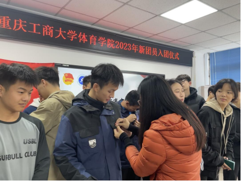分团委书记傅杨为新团员颁发团员证、佩戴团徽。胸前闪闪的团徽不仅代表着共青团员的光荣身份,也承载着共青团员的担当与责任。优秀学生代表张高源带领全体新团员面向团旗,高举右拳庄严宣誓,团旗似火,铮铮誓言,传达出团员们奋发向上的精神面貌和建功新时代的昂扬斗志。
