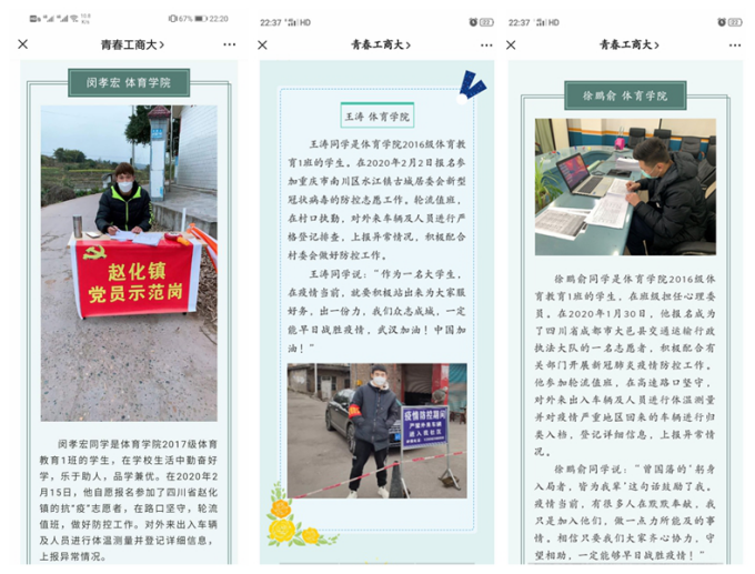 王涛同学是122cc太阳集成游戏2016级体育教育1班的学生,作为共青团员,他在2020年2月2日报名参加重庆市南川区水江镇古城居委会新型冠状病毒的防控志愿工作。轮流值班,在村口执勤,对外来车辆及人员进行严格登记排查,上报异常情况,积极配合村委会做好防控工作。