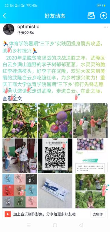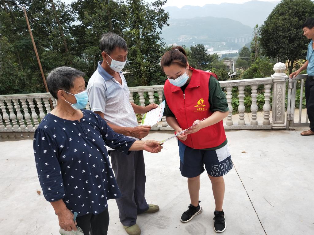 实践团成员杨瑛通过发放宣传知识手册,给当地村民宣传疫情防控知识和科学健康生活方式,普及野生动物保护和生态文明建设的相关知识,提高公众生态环保意识。同时,实践团成员心系家乡发展,为帮助农户减轻新冠肺炎疫情带来的不利影响,邀请大家走进家乡武隆、走进白云乡,通过口碑宣传、QQ、微博转发、抖音视频等进行线上线下推销,利用互联网+拓宽农产品销售渠道,打开白云乡农产品销售新市场。最后,成员通过研究调查如何更好地将山地运动体育产业和旅游产业相结合,发展乡村旅游,助推产业扶贫。
