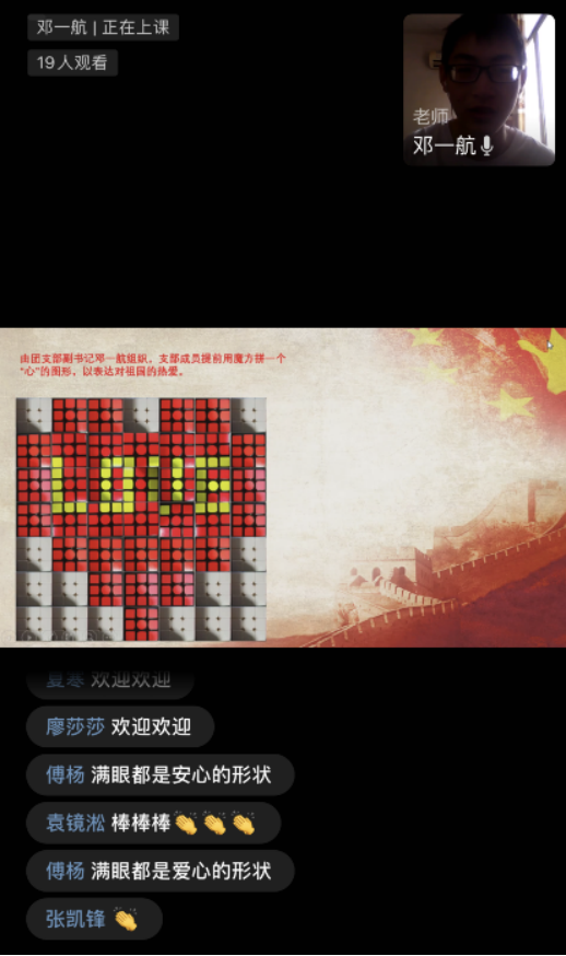 此次活动主要有“齐唱团歌”“老师致辞”“讲好防疫故事”“疫情防控及心理健康”“拼图游戏”“宣读倡议书”六个环节组成。团歌唱响,傅杨老师致辞,团日活动正式拉开了序幕。在团日活动中,同学们积极分享自己的防疫小故事以及对疫情的直观感受,认真聆听“疫情防控及心理健康”教育讲座;在拼图活动中,团支部副书记邓一航组织大家用魔方拼一个“心”的图形,来表达对祖国的热爱。拼图完成以后,邓一航同学向团支部成员展示成果,并带领团员们宣誓;最后,赵航同学作总结讲话并带领团支部宣读倡议书。