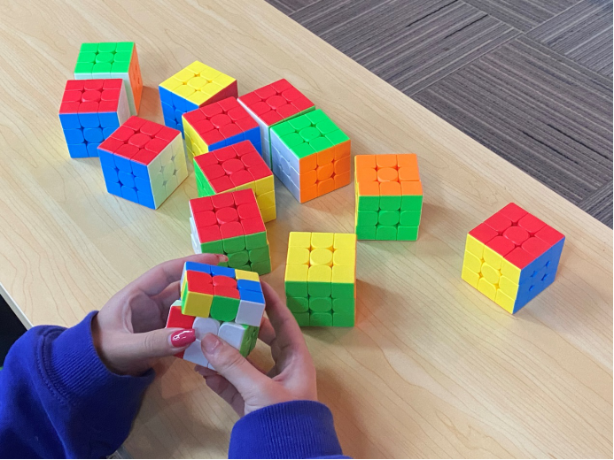 下午两点,比赛在同学们高涨的热情中拉开了帷幕,参赛者在工作人员的安排下有序的进行抽签分组,同时由专门打乱魔方的同学按公式打乱魔方,在具体的工作人员分配到比赛桌上,选手到位,准备就绪后由裁判宣布开始,并计时,同学们,在比赛过程中,沉着冷静,也并没有做出违规行为,比赛现场环境十分安静,参赛者还原魔方后示意裁判,同时裁判完成计时,经统计,参赛者中有人在短短几秒钟内就还原了魔方,还有许多只花了十几秒的优秀参赛者,在完成初赛复赛后,最终的决赛正是更是令人震惊,同学们,完成魔方还原的时间仅相差无几,还好裁判员火眼金睛,最终决赛选出了一、二、三等奖的获得者,并由M魔方社会长及管理人员为获得者颁发了奖状和奖品。