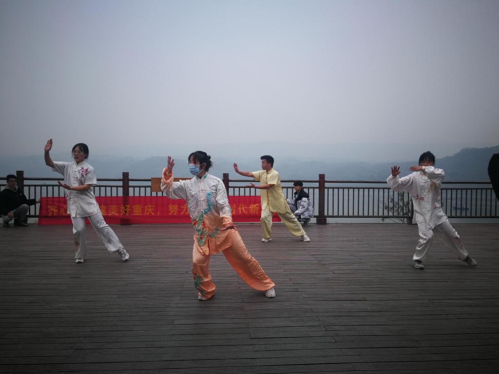 此外,同学们精心准备了诗歌朗诵《生态之歌》节目和太极拳表演,在徐徐微风中,慷慨激昂的朗诵声,行云流水的太极表演,共同描绘出一幅美丽的画卷,同学们行走阡陌之间,呼吁大家保护生态环境,建设美丽重庆。