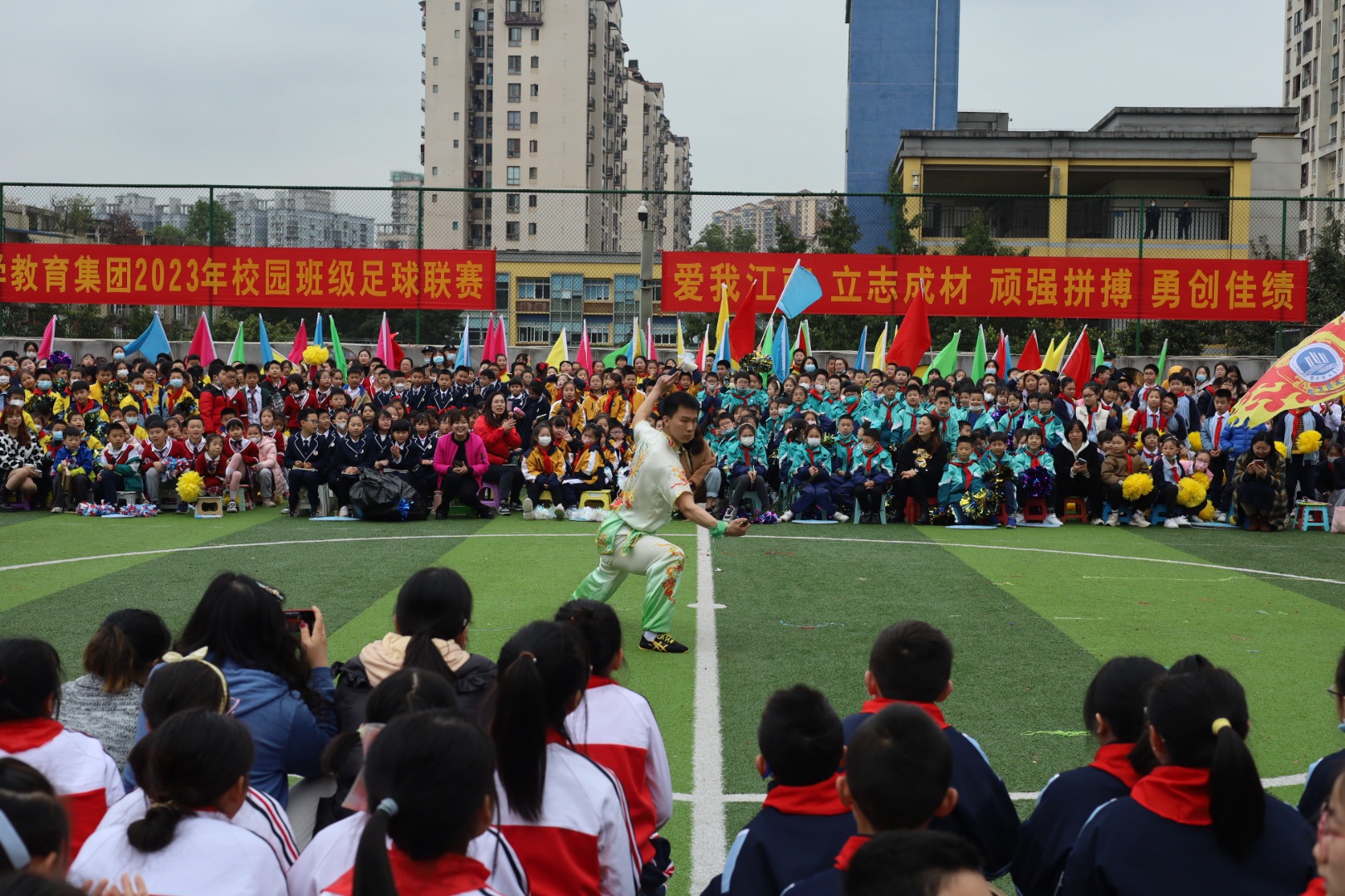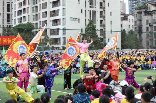 3月28日,江南小学教育集团“阳光体育 超越自我”2023年体育节隆重开幕,我校武术代表队受邀参加开幕式演出。本次演出由校团委负责老师王微带队,武术队总教练黄龙老师精心编排,来自122cc太阳集成游戏的17名武术队员们尽心排练,他们精神饱满,意气风发,为江南小学全体师生带来了一场中华武术的视觉盛宴!