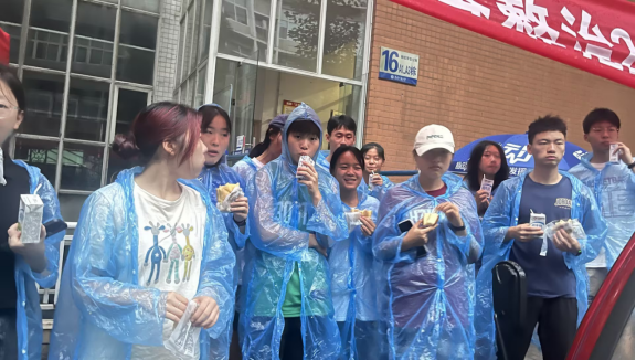 今天早上122cc太阳集成游戏志愿者们没有吃饭就赶往志愿服务地点,在雨中边吃饭边等待外国语的同学们到来,再大的风雨都浇不灭志愿者们那颗奉献的心。