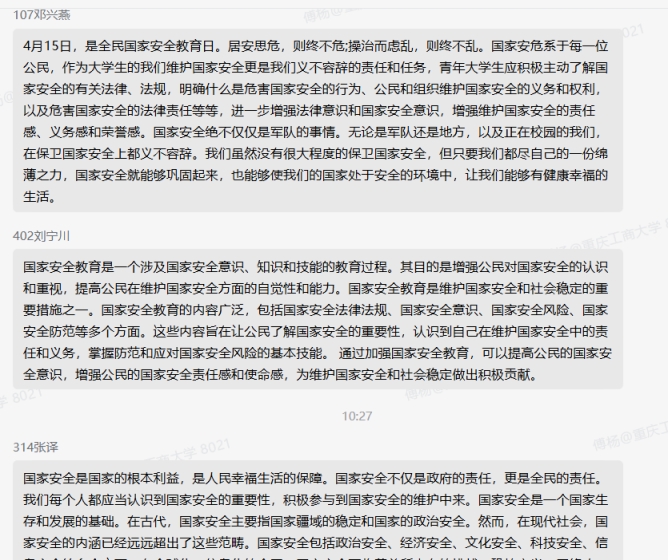 22级2班邓越谈到:经过这次学习让我对诈骗和犯法有了更深的认识,学习了安全教育,感慨很多,收获也很多,体会也很多,尤其是关于校园安全隐惠的有关问题,感触很深。在安全的问题上,来不得半点和侥幸,在安全的问题上,我们必须要防范在先、警惕在前,必须要警于思,合于规、慎于行:必须要树立高度的安全意识.人人讲安全,时时讲安全.事事讲安全;必须要笕起思想、行为和生命的安全保护站。