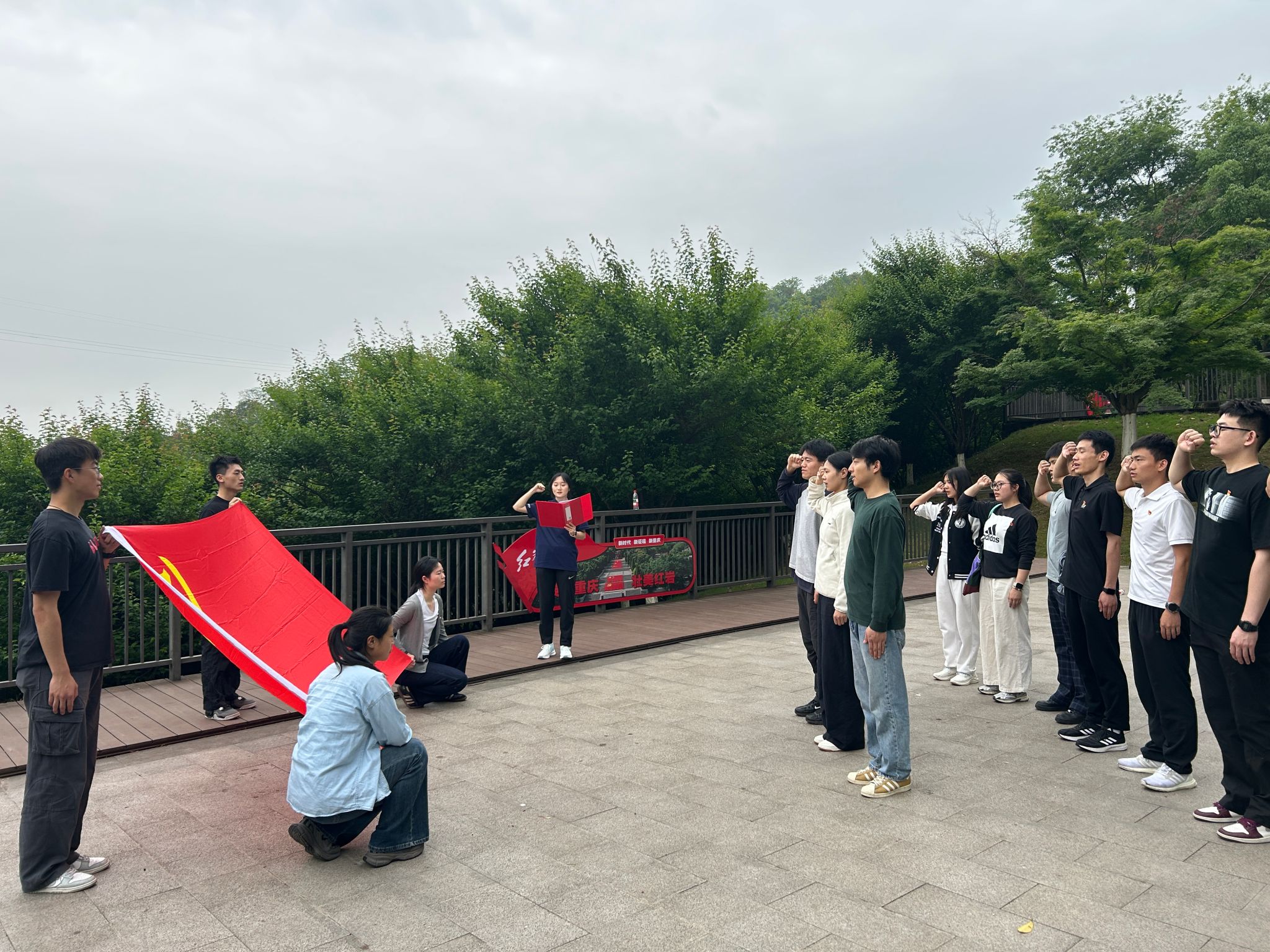 参观结束后,党支部在纪念馆广场举行了庄严的新党员入党宣誓仪式。仪式在雄壮的《国际歌》中开始,学生党支部书记胡进鸿宣读新党员名单,党员林丽萍、高泉、代义铭面向党旗高举右拳进行了转正宣誓,随后胡进鸿为新党员佩戴党员徽章,新党员代表高泉做了代表发言结束,全体党员一同重温入党誓词。胡进鸿寄语全体党员,我们要传承发扬红岩精神,在学习和实践中锤炼党性品格,要将红色基因融入专业实践,在赛场内外展现党员担当,为培养德智体美劳全面发展的社会主义建设者贡献力量。